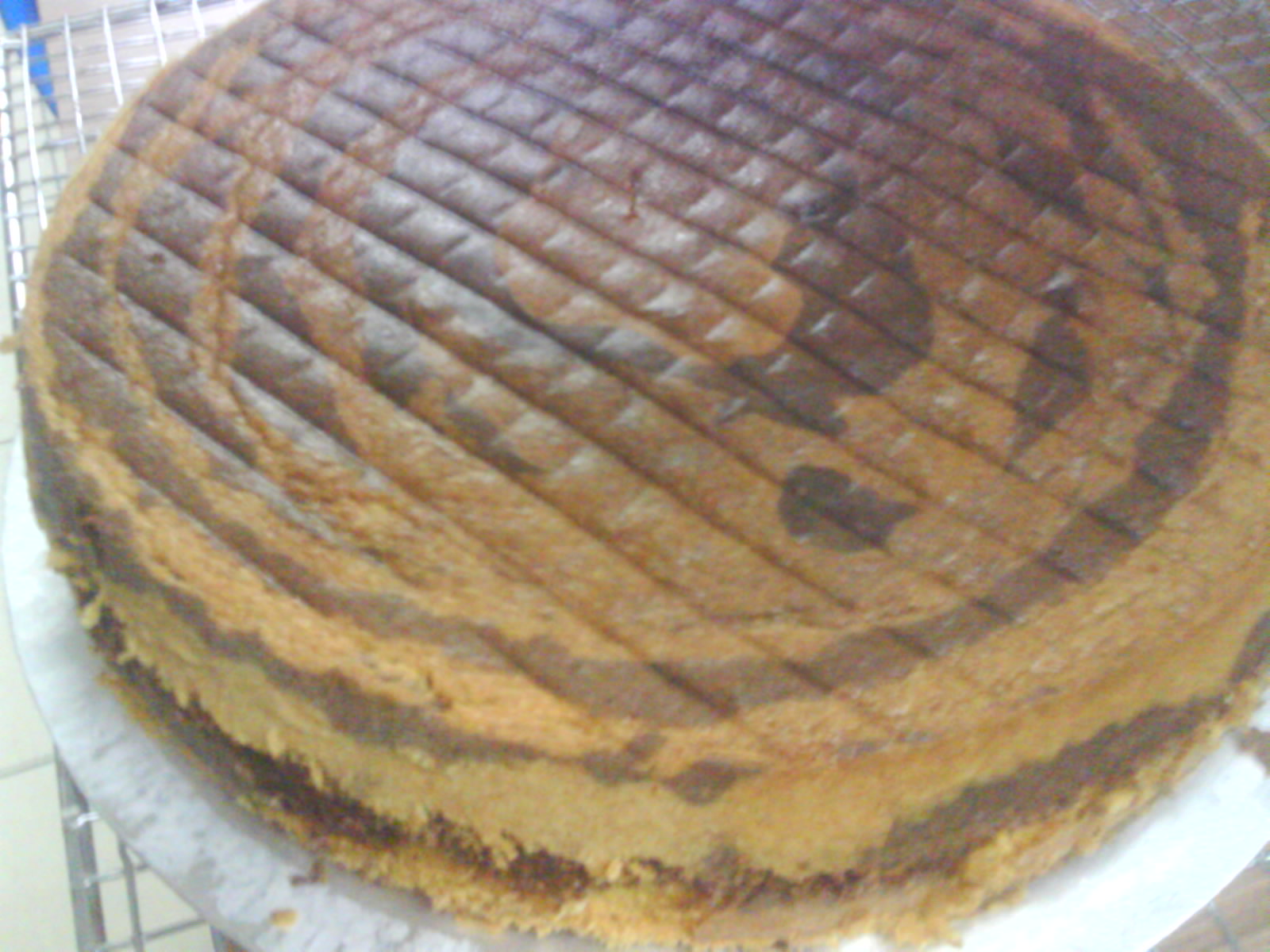 Explanation: 4 layers of alternate 4 tablespoon of vanilla and chocolate batters, then 3 layers of alternate 3 tablespoon of vanilla and chocolate batters,  2 layers of alternate 2 tablespoon of vanilla and chocolate batters, and 1 layer of alternate 1 tablespoon of vanilla and chocolate batters.