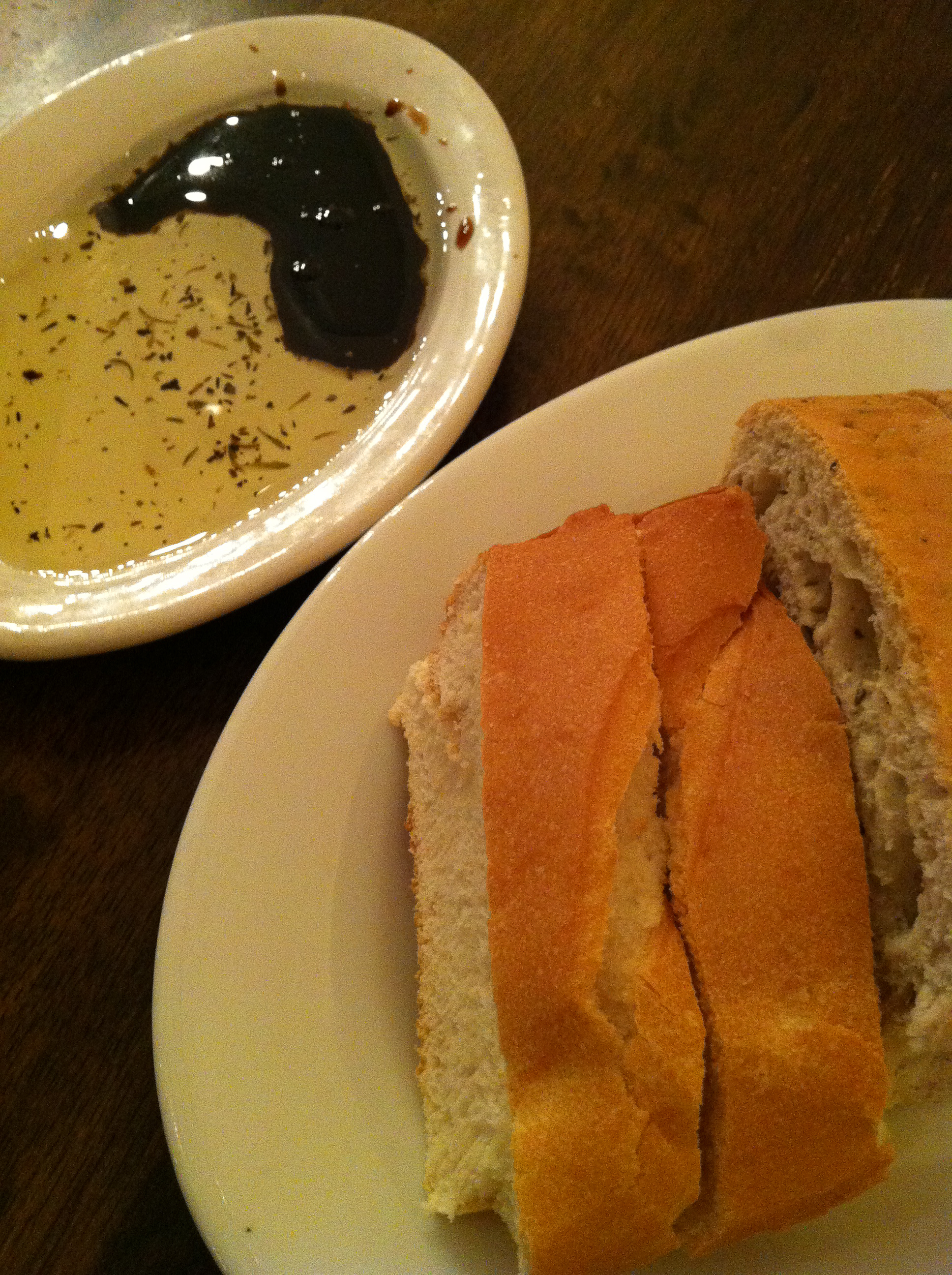 Complimentary bread, dipped into olive oil and balsamic vinegar
