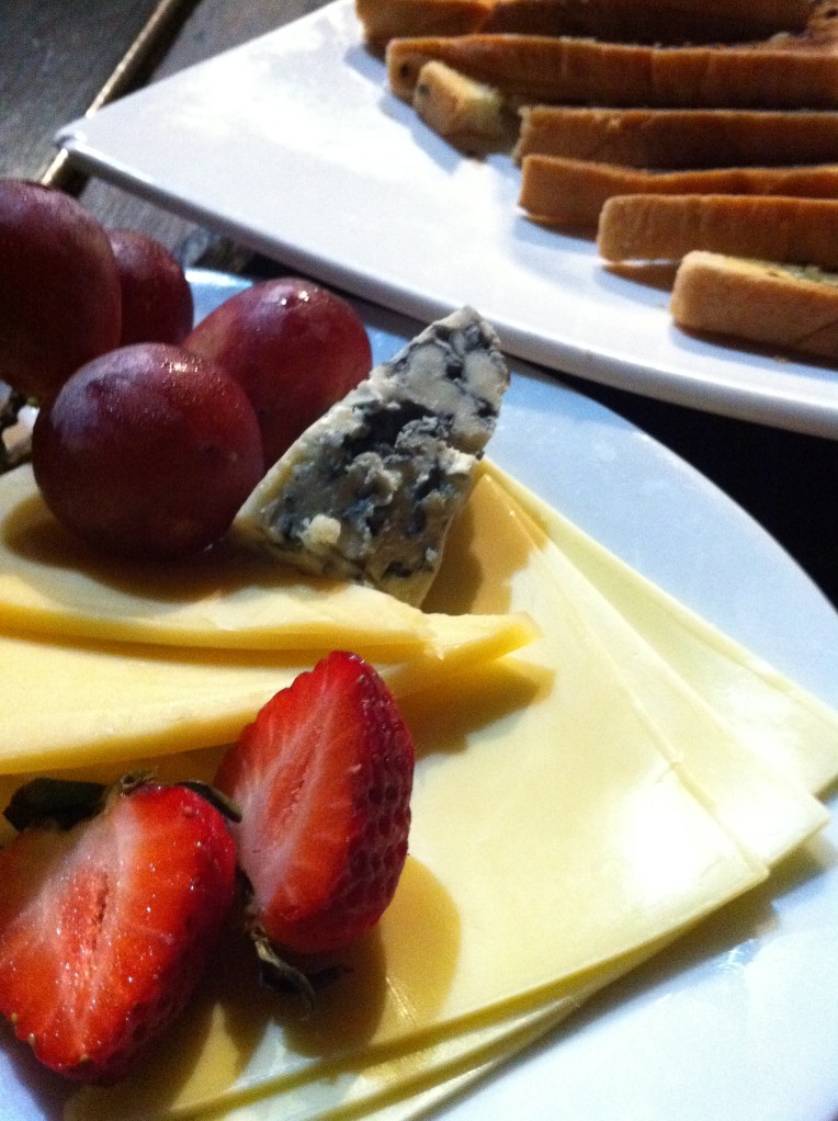 Cheese platter -blue, brie and mozzarella with fruits and toasted garlic bread, taste good with oyster bay