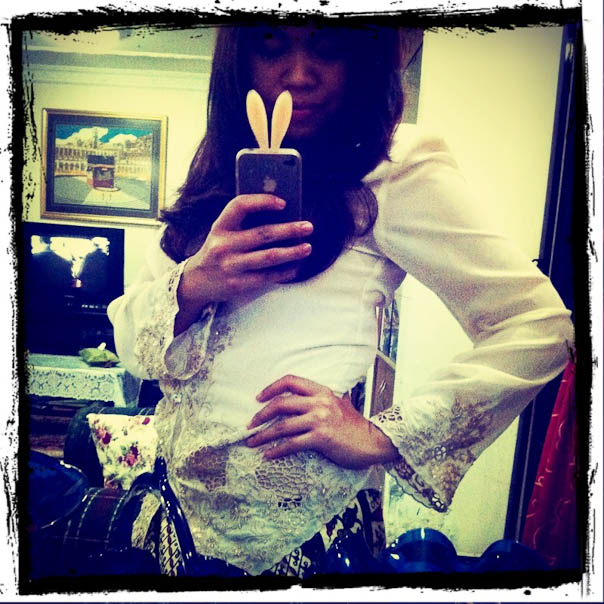 Yeah, I rawk the cream kebaya. Finally found the right shade and pattern of sarong. The sarong belong to my late grandma. It has the sumatran pattern (and I’m loving it) with brown/cream and a red/cream as the ‘kepala’ head of the sarong. I tie it in the most traditional way, with the metal chain, mwahaha. So, vintage yo.
