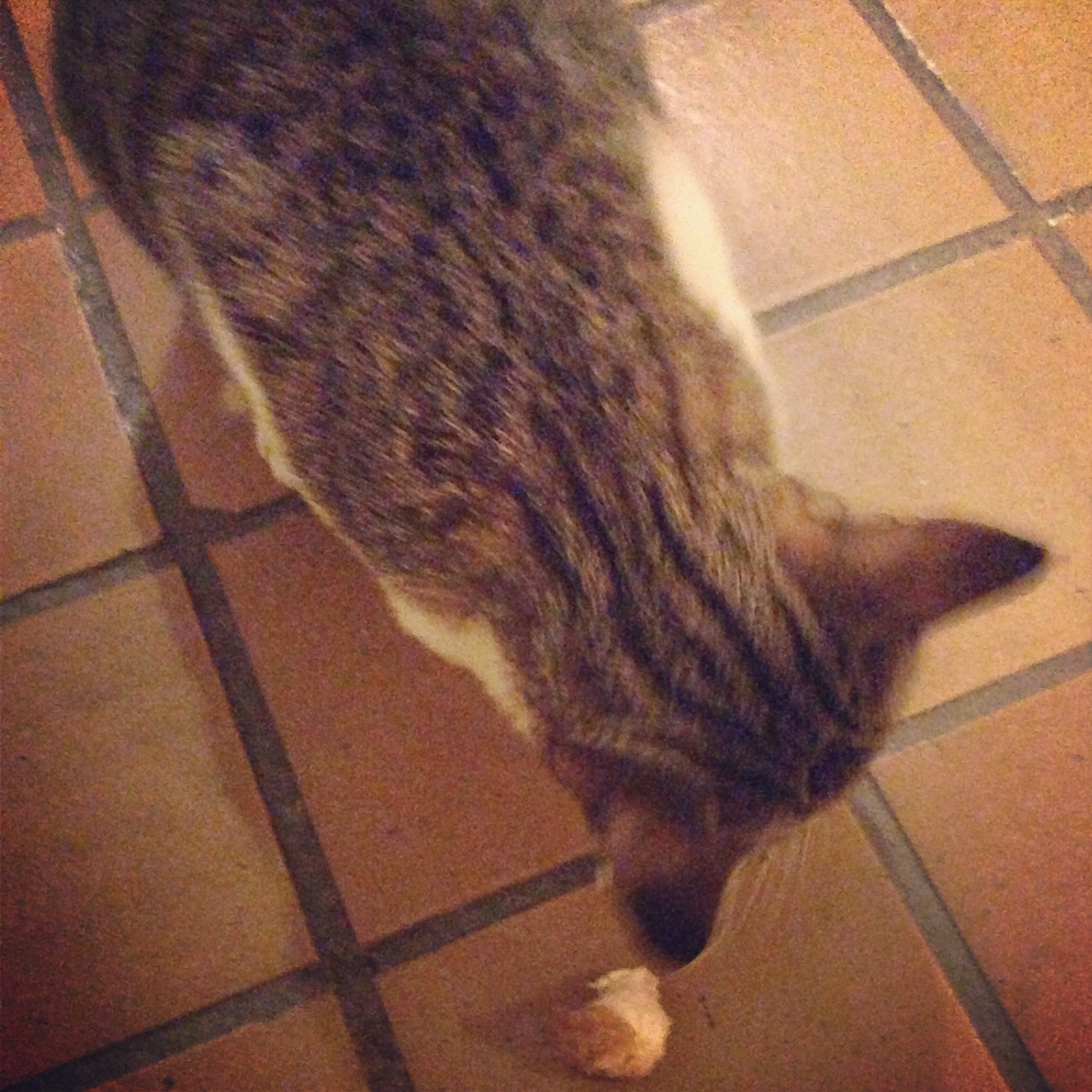 This kitty, i mean cat has been loitering around my unit floor, and yesterday when i came back from the gym.. the cat greeted me at the lift lobby. Aw. Poor cat, i pat the cat and the cat trying to smell my dinner. I bought KFC for dinner, since I thought, i can eat one chicken tonight and keep another one for tomorrow. But upon seeing this poor cat, sniffing on my dinner, my heart sank. I pat the cat for a while and then walked in to put my stuff/bags in, and came out with one piece of chicken. I know it’s very hard for the cat to eat the whole piece in one go, so I tear off the chicken into small pieces, and oh boy, the cat really starved.