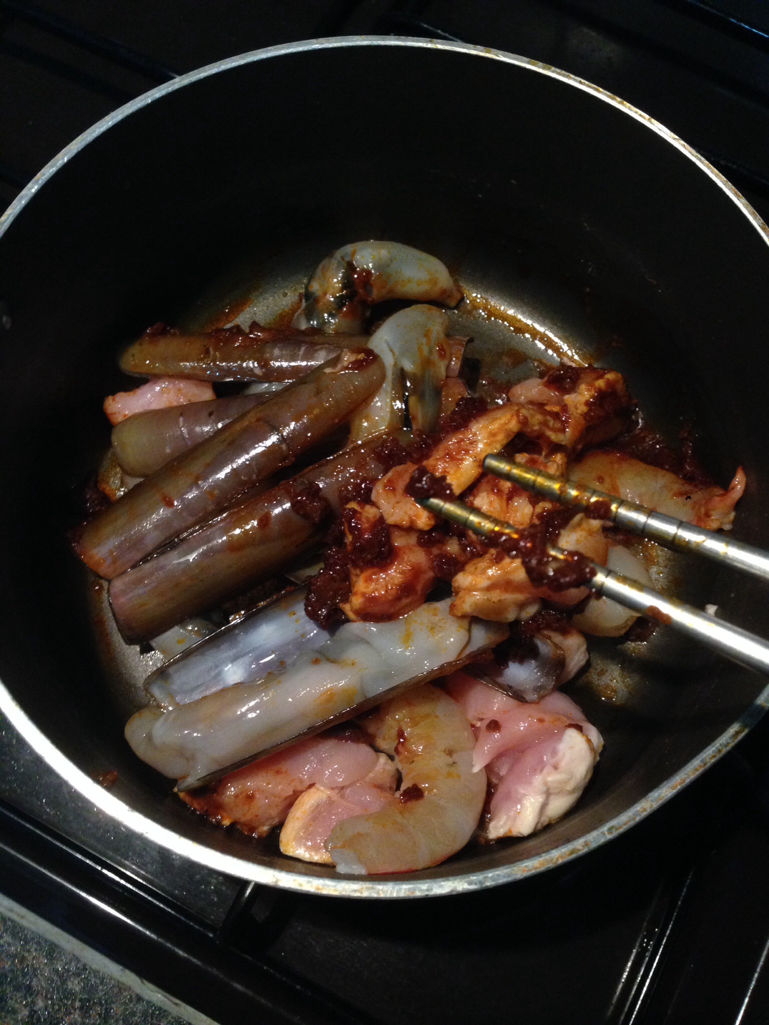 On my second attempt of cooking it with more stuff.. I stir-fry the prawn, bamboo shell, chicken with chills. This is to ensure that the chilli will seep in to the prawns etc. Then, I added fried tofu, veggie and hard boiled egg…