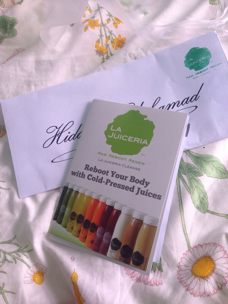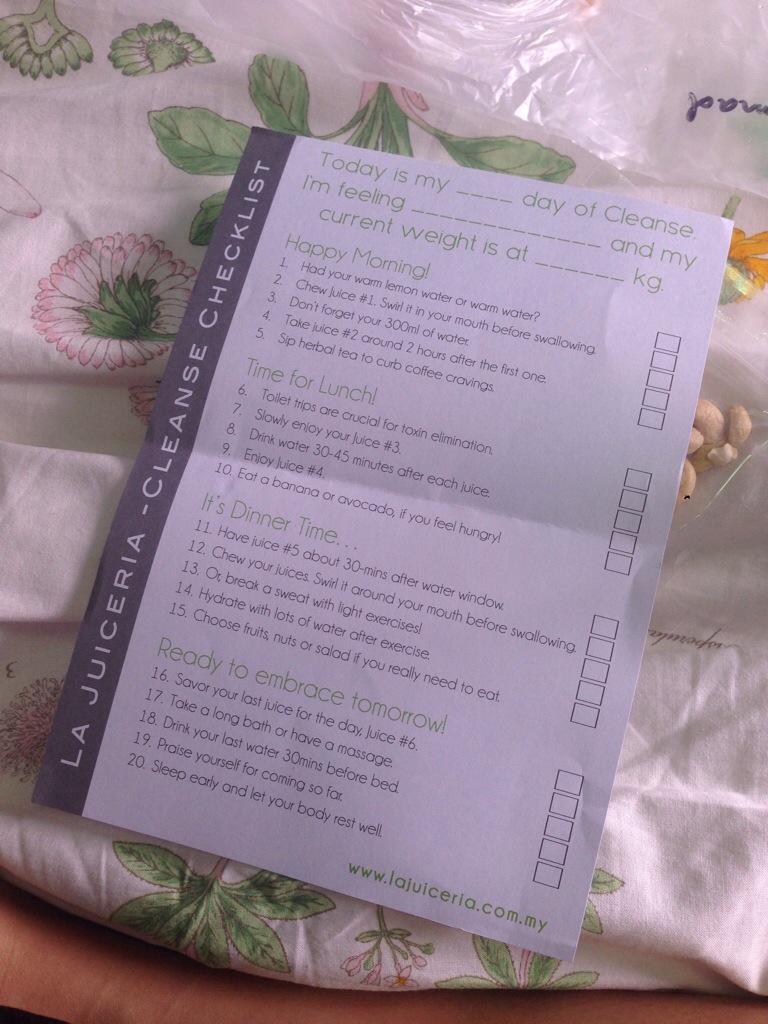 I ordered my 1 day juice cleanse problem 2 days ago from La Juiceria and I just collected from their Hartamas office. Apparently their office is just behind my client’s office, and am there like every week for a meeting. LOL. 20140914-162040-58840643.jpg     They printed my name in the envelope with a checklist and  the cleanse journal. 2 20140914-162041-58841458.jpg   there are 6 bottle you need to finish in a day, drinking each bottle every two hours. So am going to bring the whole bottle to work tomorrow, and will keep it in the fridge. 20140914-162042-58842545.jpg   There’s a schedule to follow, am okay with liquid the whole day, but to drink water, every hour is like a pain to me. Hence, am always dehydrated LOL. 20140914-162043-58843491.jpgThere’s even a checklist to follow !! But, I don’t have a weighting scale. I need to buy one. I’ll let you know the outcome tomorrow. Eh, wait, I ordered another 2 days of juices and they’ll send it over to my office tomorrow. So, it’s going to be a 3 day juice cleanse programme. Wish me luck !! You can order La Juiceria from their website at La Juiceria  or you can visit their Facebook / instagram.