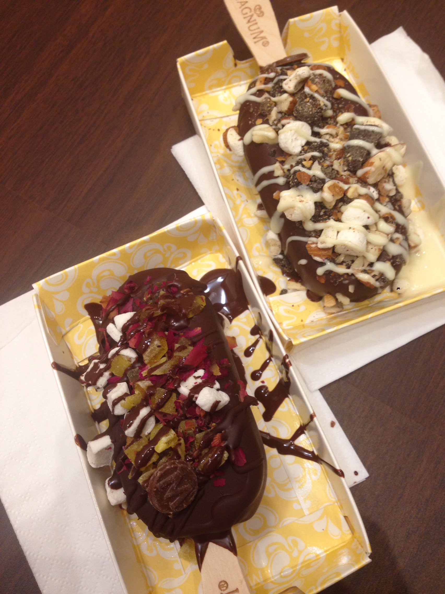 My first make-my-magnum vanilla ice-cream coated with dark chocolate, topped with marshmellow, dried mango and rose petal and drizzle in dark chocolate sauce yummm