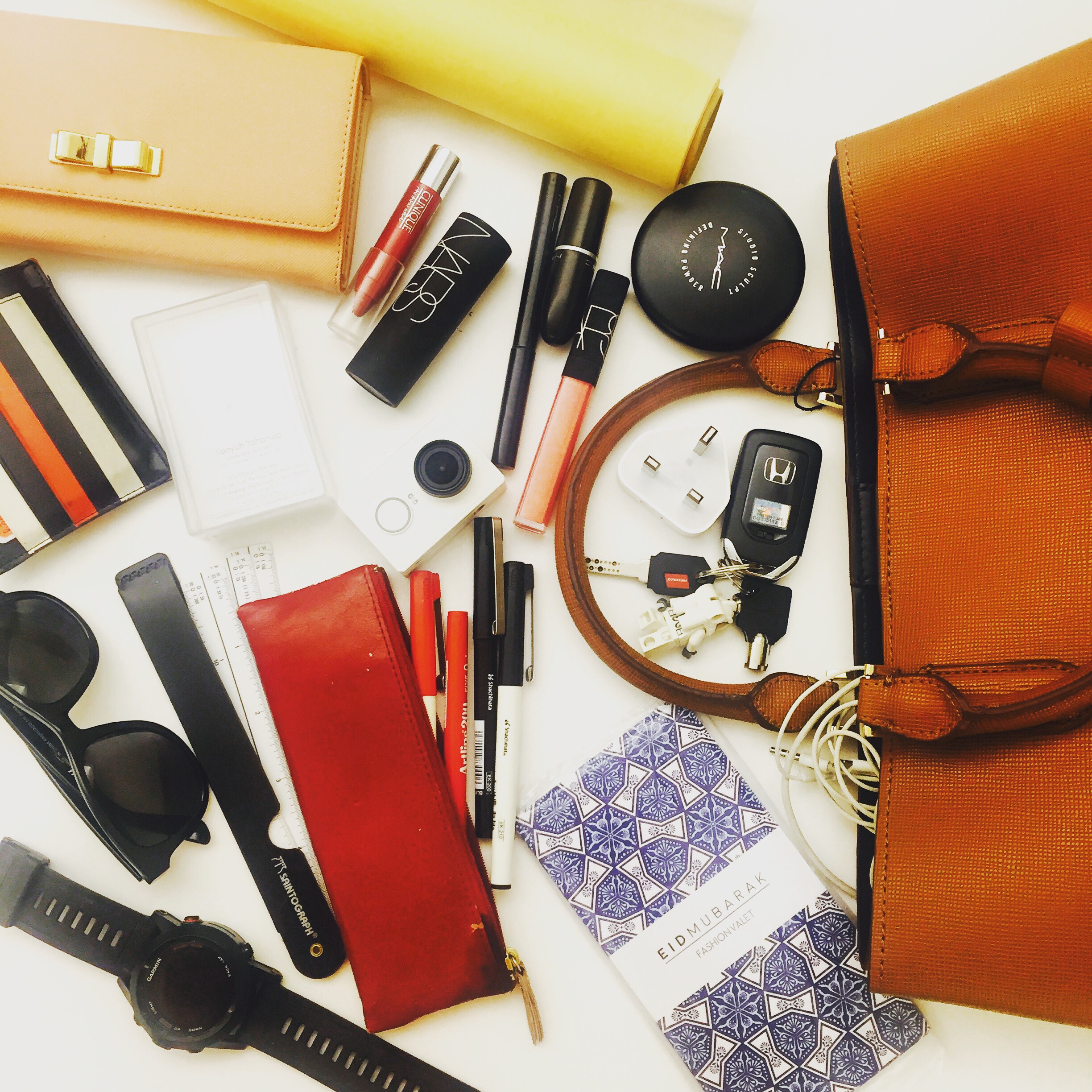 Its my latest zara bag. I have my purse, keys, shades, GPS watch, wires, my NARS multistick, lipgloss, my red mac lipstick, clinique fat stick, MAC eyeliner and powder, my Yi camera, a box of name card, scale ruler, canary paper, pen and artline, fashionvalet raya packet. Yep. A lot.