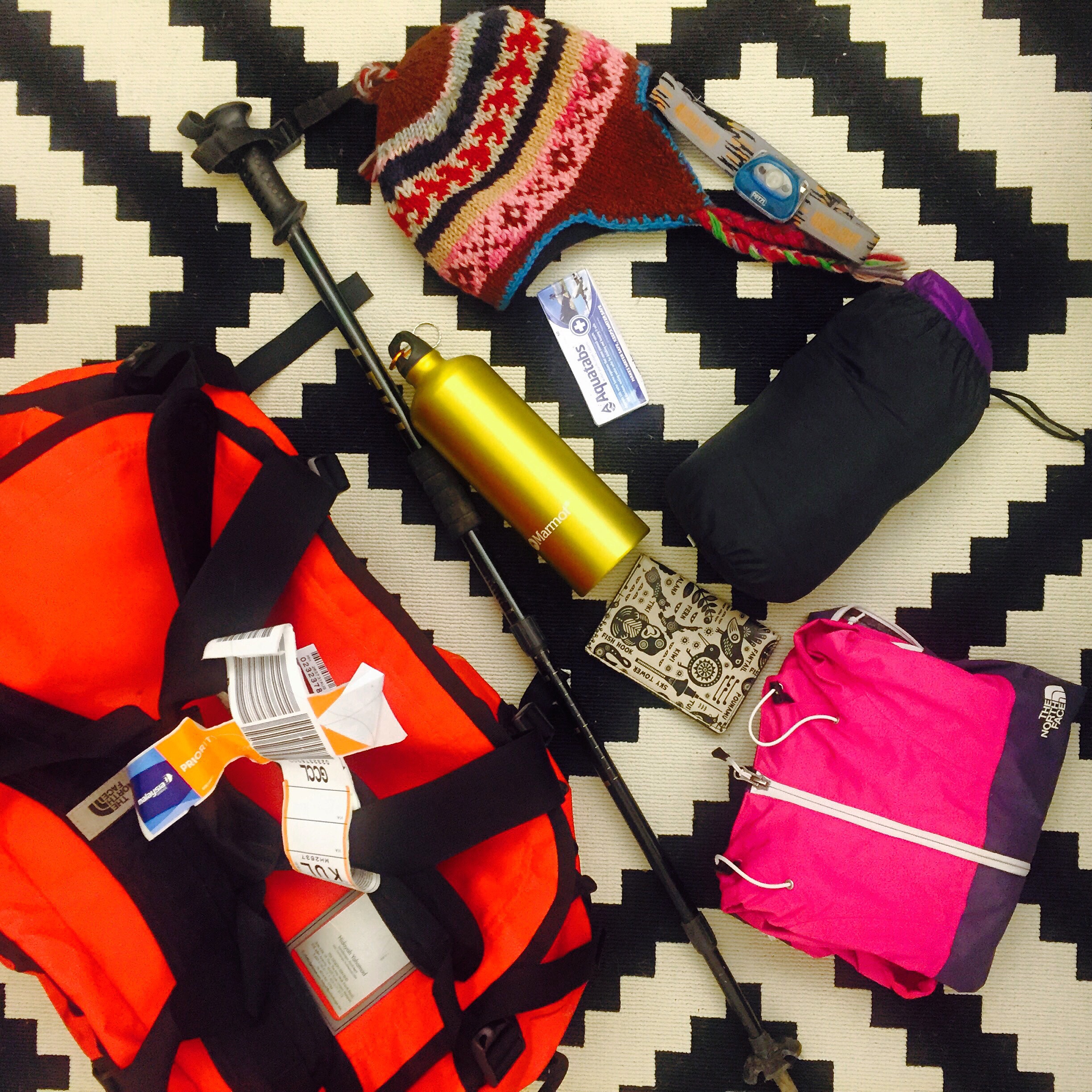 My North Face bomber bag, its NF base camp bag actually. I have a lot of stuff actually bug only a few i can layflat, my northface triclimate jacket, north face down jacket, mammot bottle, aquatabs, petzl headlamp, dhaka topi, and passport.