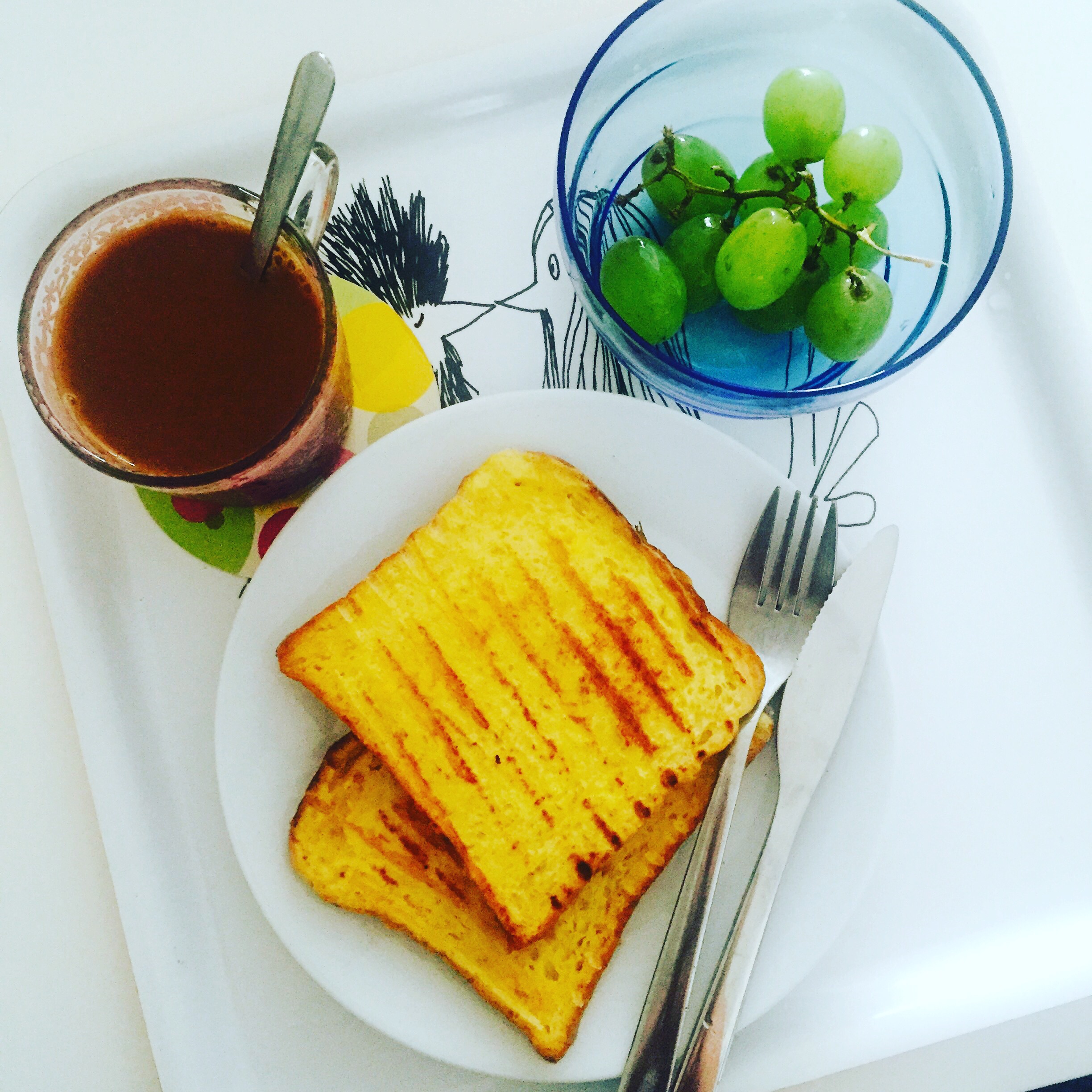 Example of my breakfast. French toast with fruits and coffee. This was yesterday.
