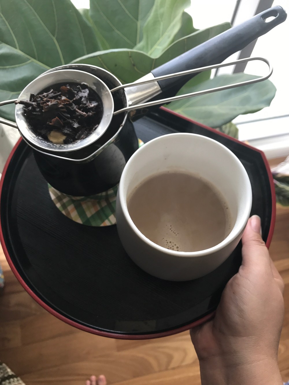 Basically you mix up the spices and soy milk in the stainless steel stove top pot, and let it shimmer. Strain it to the cup and wallaa… would you like a cup of tea sir? Ha ha.